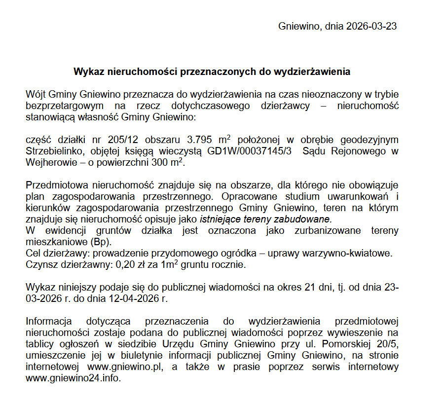 Wykaz nieruchomości przeznaczonych do wydzierżawienia, działka nr 205/12 obr. Strzebielinko Karol Grubba 2026-03-24 Gospodarka nieruchomościami 0 Comments