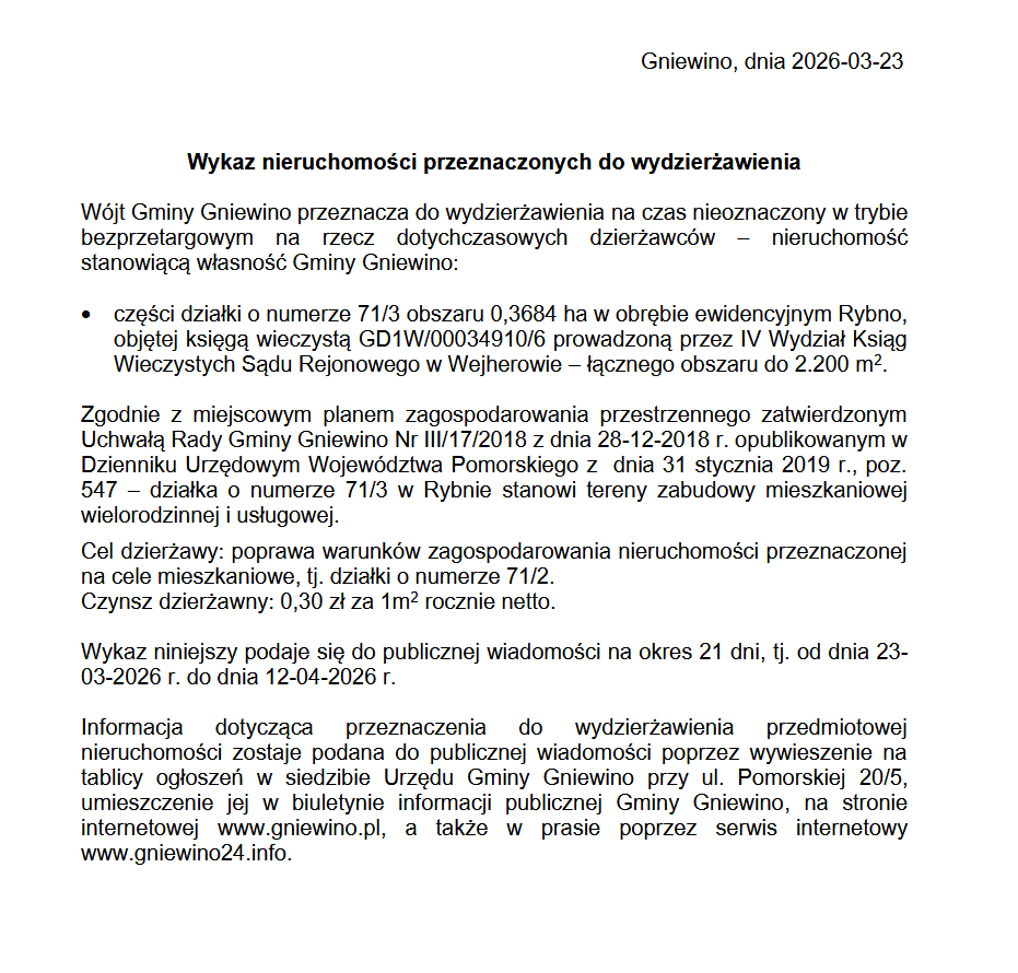 Wykaz nieruchomości przeznaczonych do wydzierżawienia, działka nr 71/3 obr. Rybno Karol Grubba 2026-03-23 Gospodarka nieruchomościami 0 Comments